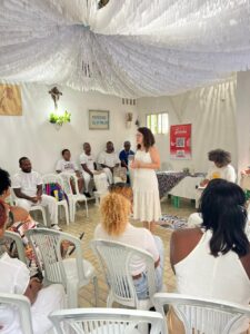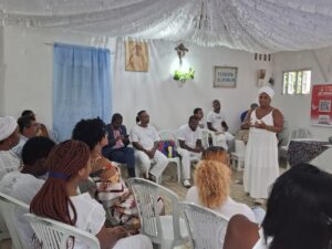 Após a saudação de boas vindas da Iyalorixá responsável pelo Terreiro, Mãe Nicinha de Nanã, a assessora de KOINONIA, Camila Chagas, abriu os trabalhos fazendo uma retrospectiva sobre o trabalho da assistência religiosa no presídio feminino e de como KOINONIA foi provocada pelos povos de terreiro para assessorar na realização dos trabalhos (lembre aqui: https://kn.org.br/acervo/assistencia-religiosa-de-matriz-africana-no-sistema-prisional-feminino-e-tema-de-roda-de-dialogo-no-espaco-vovo-conceicao/17144/ e aqui: https://kn.org.br/noticias/koinonia-facilita-roda-de-dialogo-com-agentes-do-conjunto-penal-feminino/17794/)
