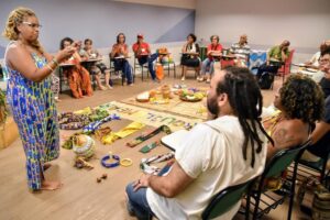 Entre as participações do curso, destacou-se a atuação de Ana Gualberto, representante de KOINONIA – Presença Ecumênica e Serviço, que contribuiu como assessora em dois momentos centrais da programação. No dia 13 de janeiro, conduziu a oficina “Ser Uma com a Terra: Sabedorias Ancestrais em Diálogo”, abordando a relação entre espiritualidade, ancestralidade e cuidado com o planeta. No dia 14, integrou a mesa temática “Racismo Ambiental: Resistências do Quilombo”, aprofundando o debate sobre os impactos da degradação ambiental nos territórios quilombolas e as estratégias comunitárias de enfrentamento.