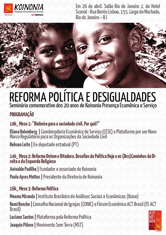 As comemorações, no melhor estilo koinônico, começam na sexta-feira (25) com um ato ecumênico e inter-religioso, a partir das 18h, na capela do Colégio Sion. No dia seguinte, promoveremos o seminário “Reforma Política e Desigualdades”. Aberto ao público, o evento começará às 10h, no Hotel Scorial, e contará com a presença de nossos associados, parceiros e representantes da sociedade civil de diferentes campos de atuação e quem mais tiver interesse no tema.